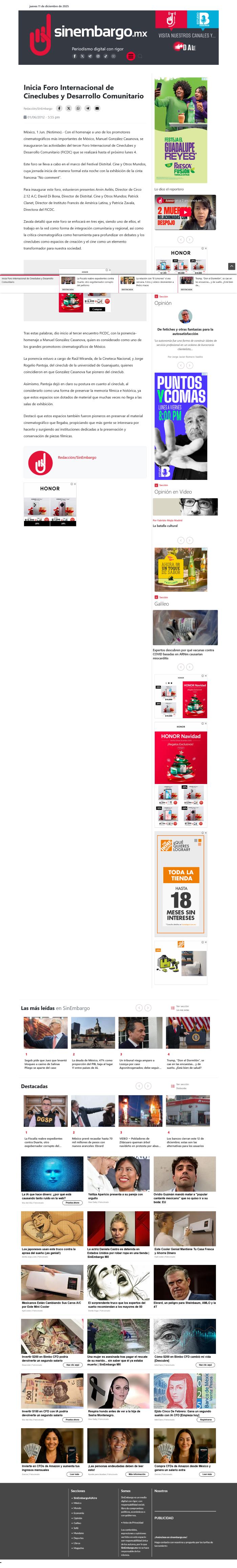 Nota en el Portal Sinembargo.mx - Inicia Foro Internacional de Cineclubes y Desarrollo Comunitario 2012