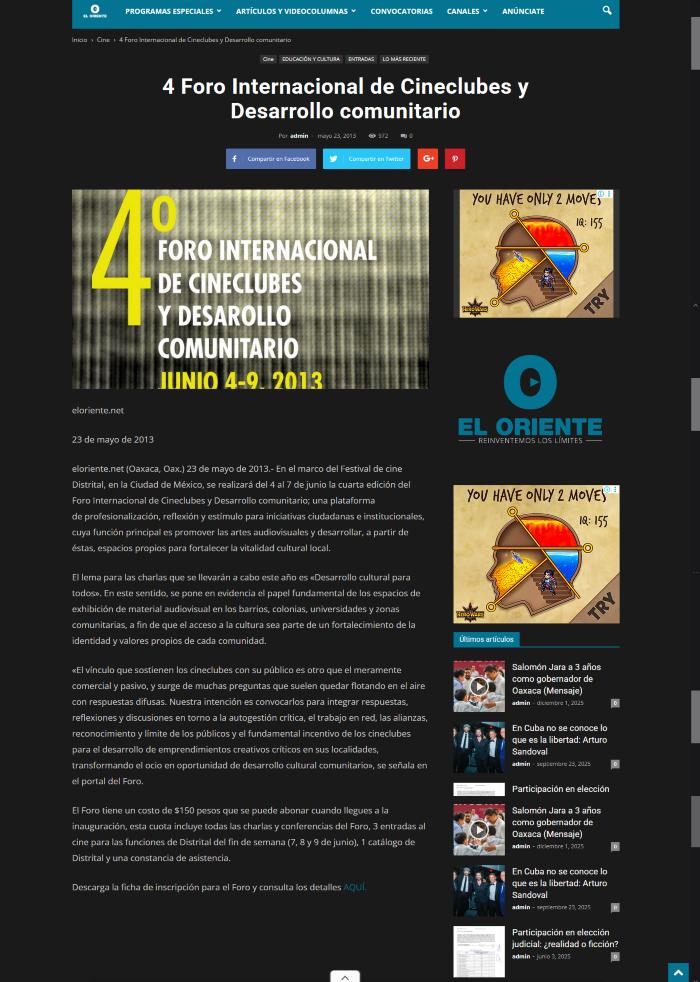 Nota del Portal El Oriente Oaxaca - 4 Foro Internacional de Cineclubes y Desarrollo Comunitario