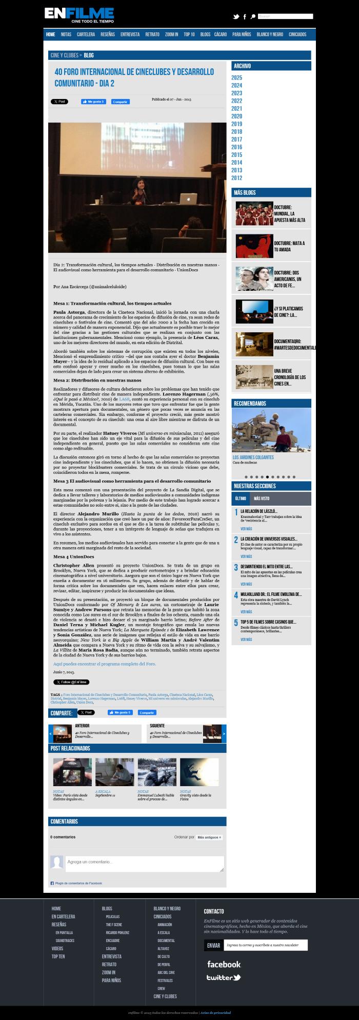 Nota del Portal En Filme - 4o Foro Internacional de Cineclubes y Desarrollo Comunitario Día 2